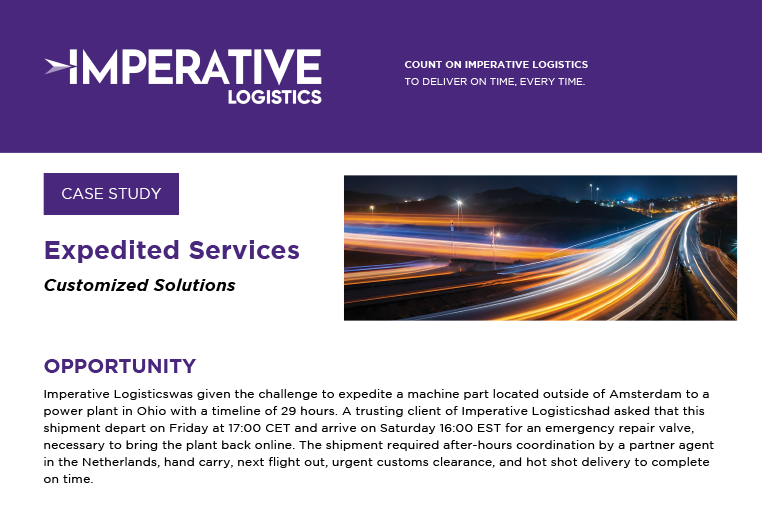 Imperative Logistics delivers expedited air and ground solutions built for speed, precision, and total confidence. With access to more than 15,000 domestic and cross-border flight options and a nationwide fleet of over 50,000 vehicles, from sprinter vans to temperature-controlled and liftgate-equipped trucks, we move shipments on your timeline, not the other way around. Our 24/7/365 operations team engineers the fastest routes, providing proactive communication, real-time visibility, and automated alerts at every critical checkpoint. Whether it’s a small, time-sensitive part or a mission-critical shipment demanding white-glove handling, we make sure it arrives exactly where it needs to be, securely, swiftly, and without compromise.